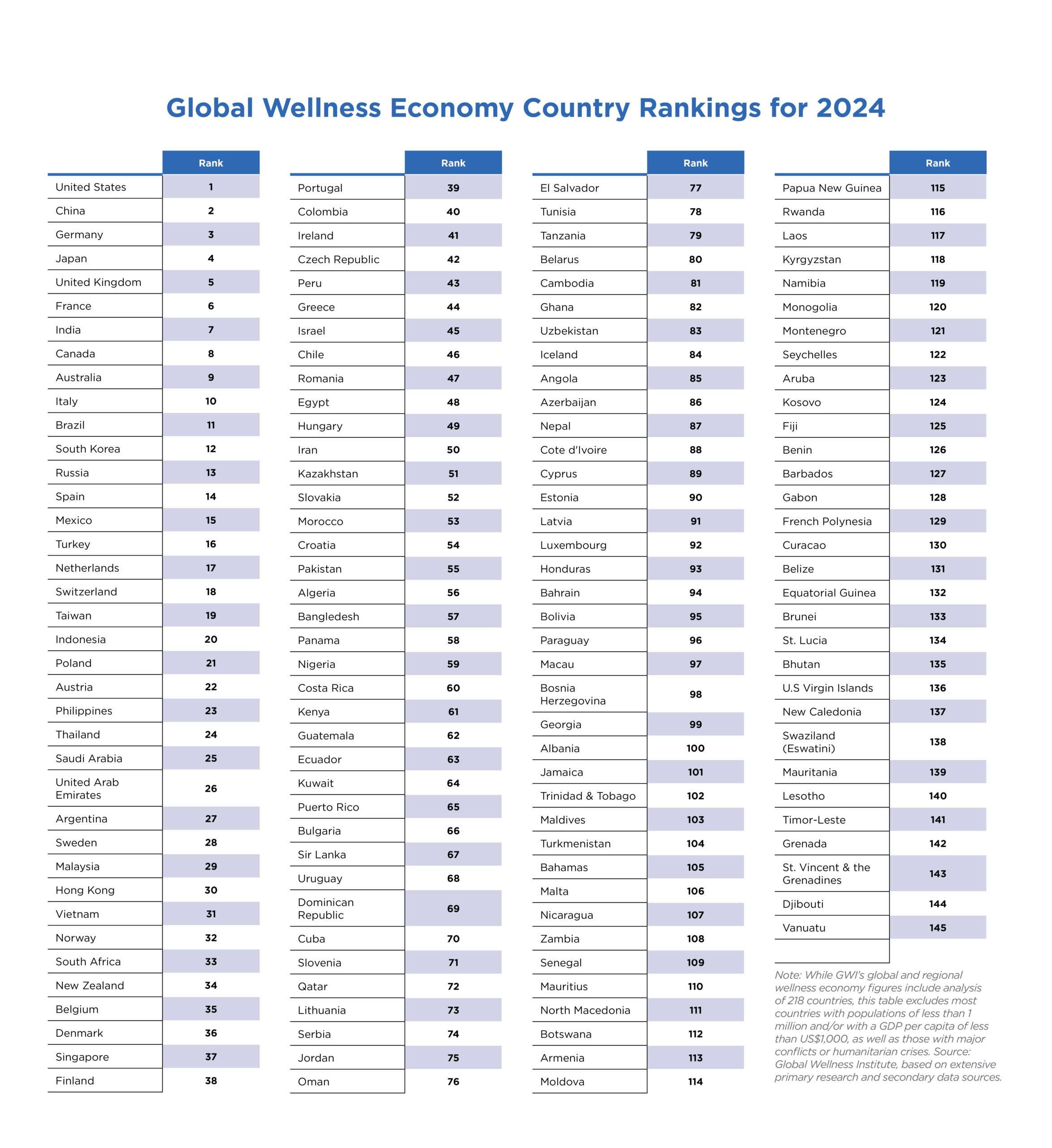 In January 2026, the Global Wellness Institute (GWI) released The Global Wellness Economy: Country Rankings (2019-2024), which is the only study to measure and rank the wellness economy across the world’s regions and countries. The report ranks 145 countries by the size of their wellness economies, compares wellness to the size of each country’s overall economy, examines per capita spending on wellness at the country level, and explores five-year growth trends for the wellness market across different countries.