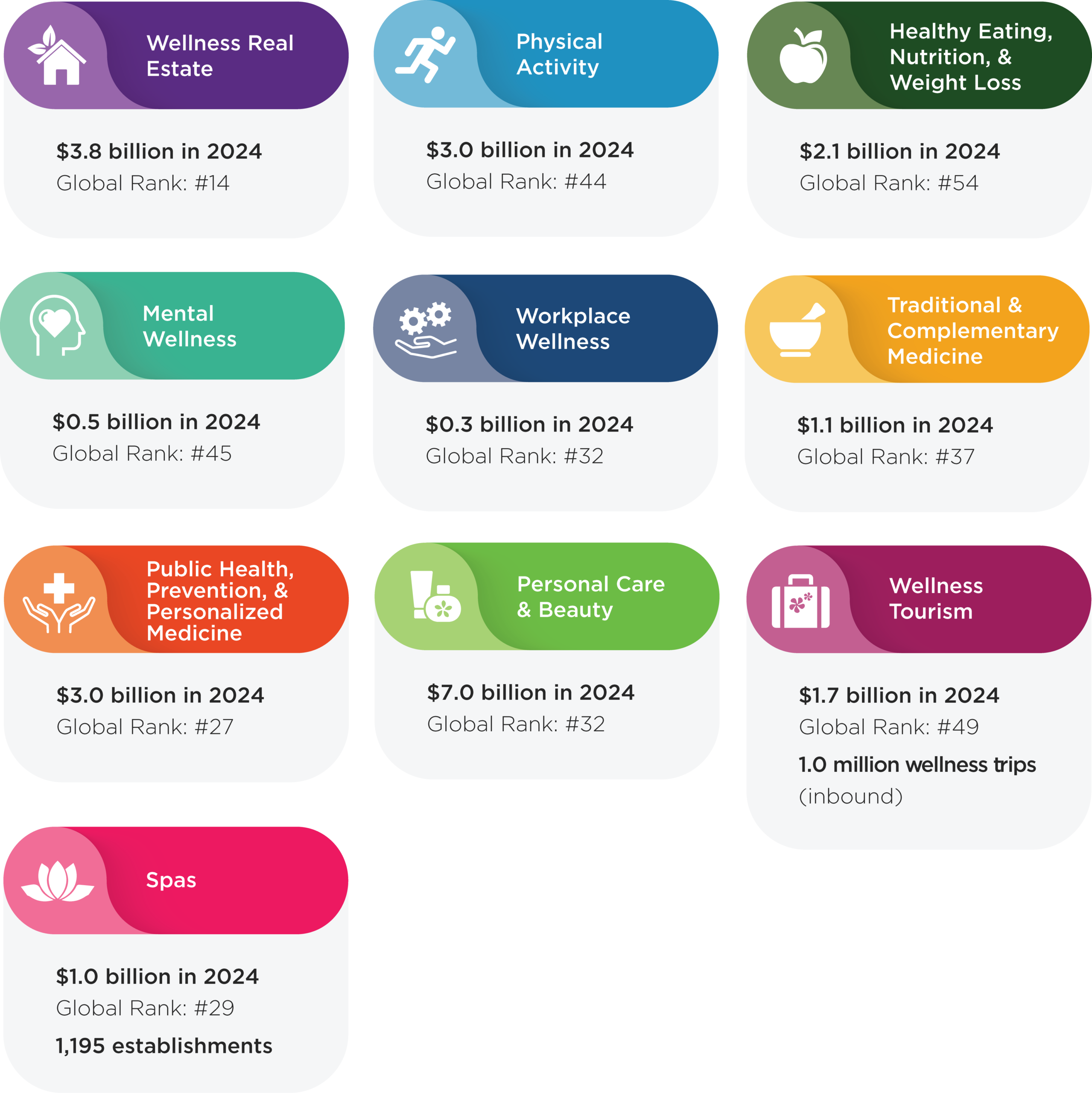 The wellness economy, as defined by GWI, is broad and diverse. Its eleven sectors encompass many different types of consumer activities and expenditures, including products, services, travel, and technology. Every country’s wellness economy is unique. Its composition can vary widely from country to country, based on its development history, culture, socioeconomic conditions, and government policy. Below we present Singapore’s top-line wellness economy data and how it ranks globally. More details are available in the downloadable country report.