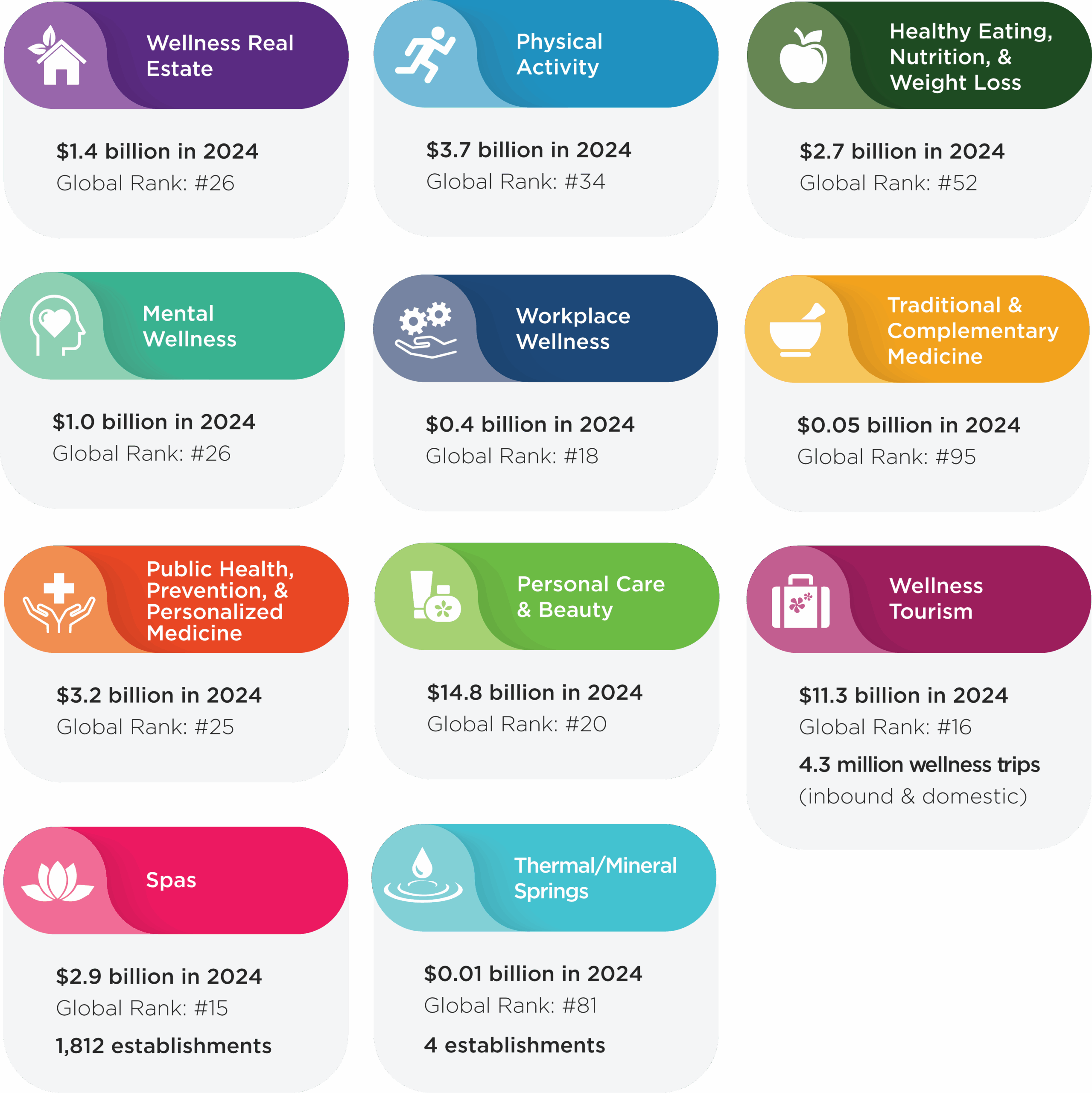 The wellness economy, as defined by GWI, is broad and diverse. Its eleven sectors encompass many different types of consumer activities and expenditures, including products, services, travel, and technology. Every country’s wellness economy is unique. Its composition can vary widely from country to country, based on its development history, culture, socioeconomic conditions, and government policy. Below we present Saudi Arabia’s top-line wellness economy data and how it ranks globally. More details are available in the downloadable country report.