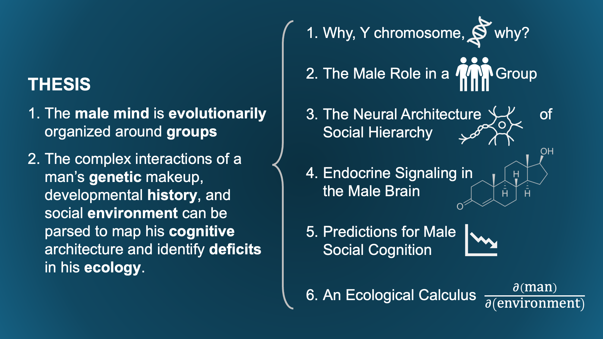 The Biological Basis of Male Social Dynamics The Cognitive Ecology of Men — Essay Series The Biological Basis of Male Social Dynamics Why, Y Chromosome, Why? The Male Role in a Group The Neural Architecture of Social Hierarchy and Male Group Behavior Endocrine Signaling Through the Male Social Brain Predictions for Male Social Cognition An Ecological Calculus Opening What is the measure of a man?…
