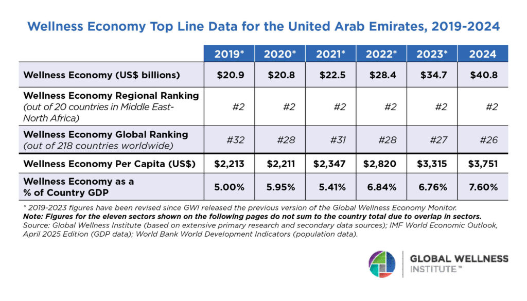 Miami, FL – November 20, 2025 – The non-profit Global Wellness Institute (GWI), the leading research organization for the global wellness industry, today released a new report on the wellness economy of the United Arab Emirates (UAE)—revealing it is the fastest-growing in the Middle East/North Africa (MENA) region and is now valued at $40.8 billion.