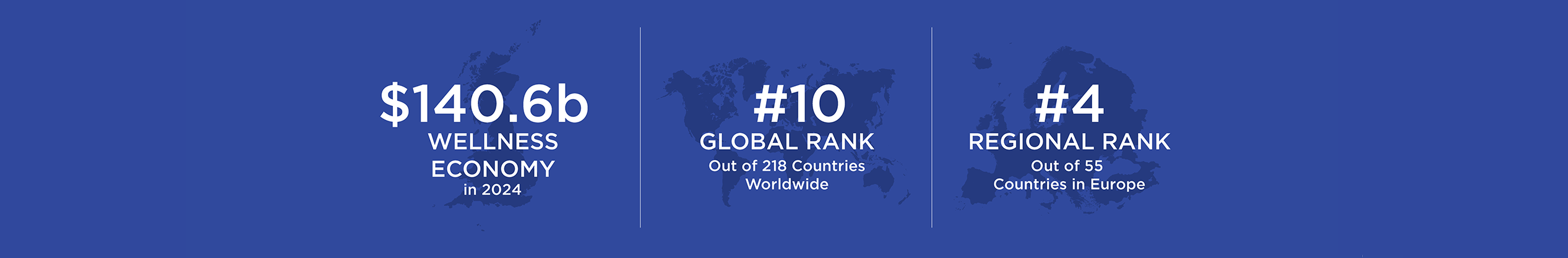 The wellness economy, as defined by GWI, is broad and diverse. Its eleven sectors encompass many different types of consumer activities and expenditures, including products, services, travel, and technology. Every country’s wellness economy is unique. Its composition can vary widely from country to country, based on its development history, culture, socioeconomic conditions, and government policy. Below we present Italy’s top-line wellness economy data and how it ranks globally. More details are available in the downloadable country report.