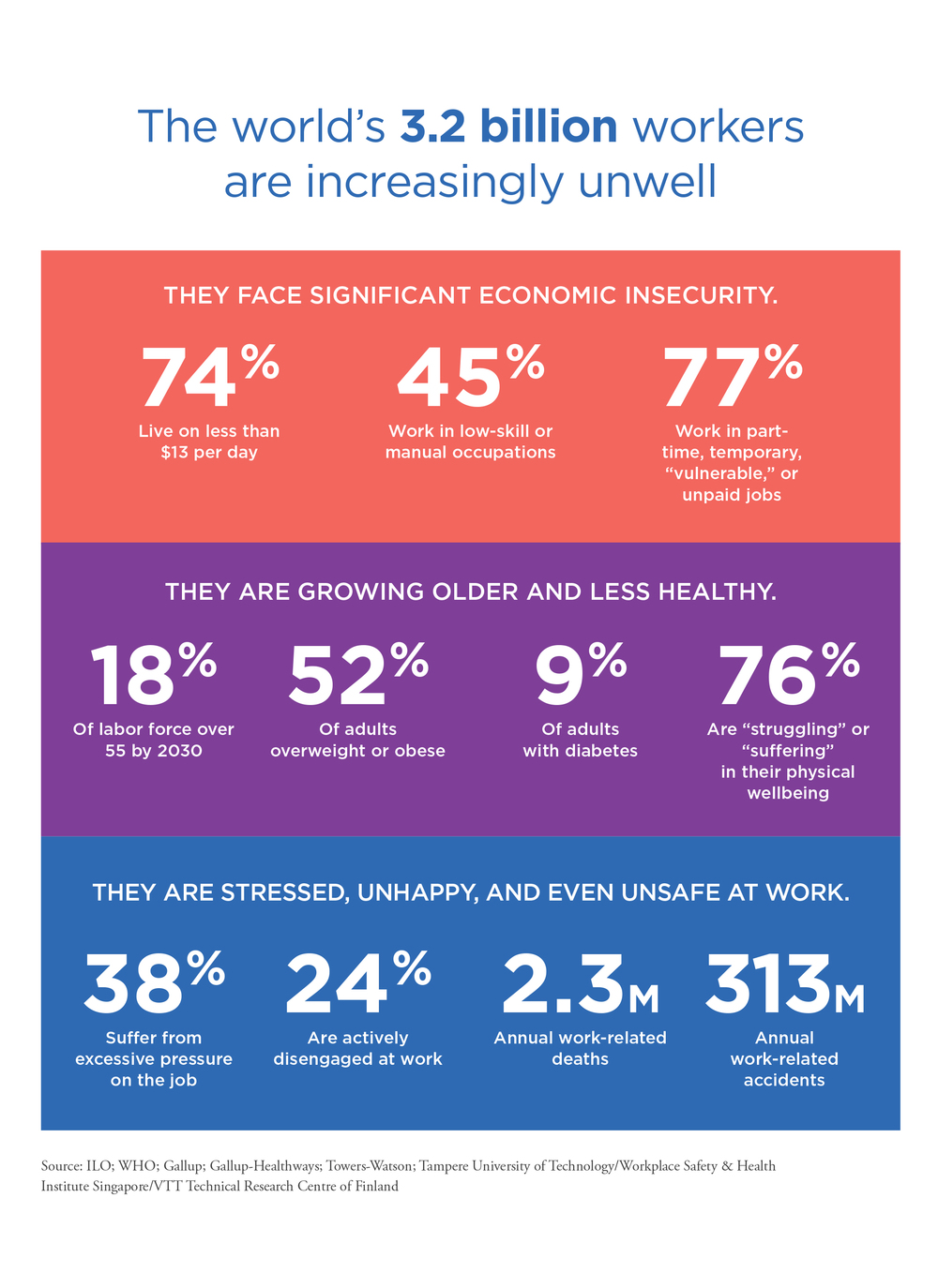 Most of the world’s 3.4 billion workers are unwell. They live with serious economic insecurity: 74% make less than $13/day; 45% are in low-skill/manual jobs; 77% are in part-time or unstable jobs. They’re aging at an historic rate: 18% of the workforce will be over 55 by 2030. They’re unhealthy: 52% are overweight/obese, and 76% report they’re struggling with their wellbeing.